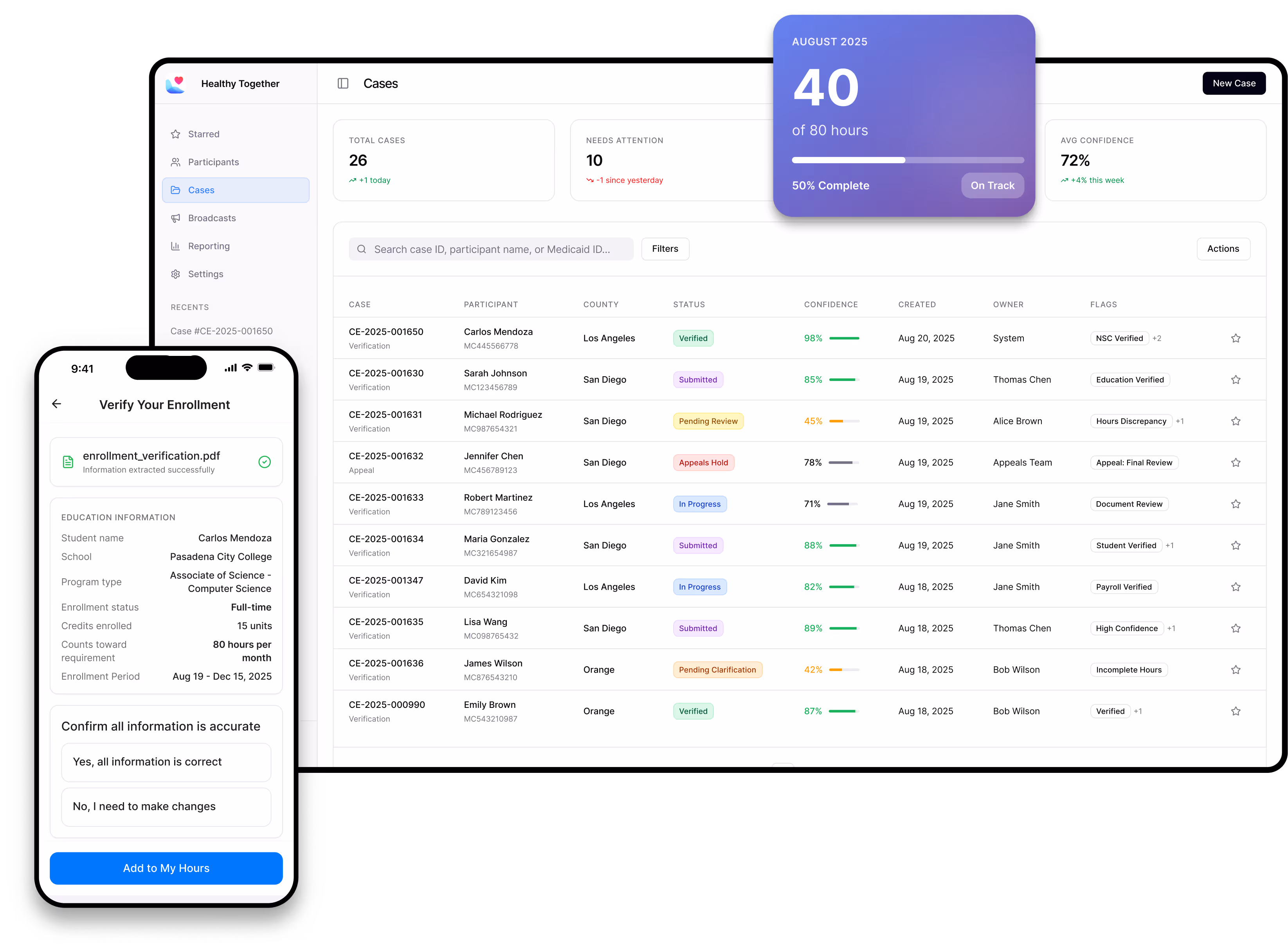Provide a simple, guided way to log hours, upload documentation, and track progress. Real-time updates and secure messaging ensure participants stay informed and engaged throughout the eligibility process.